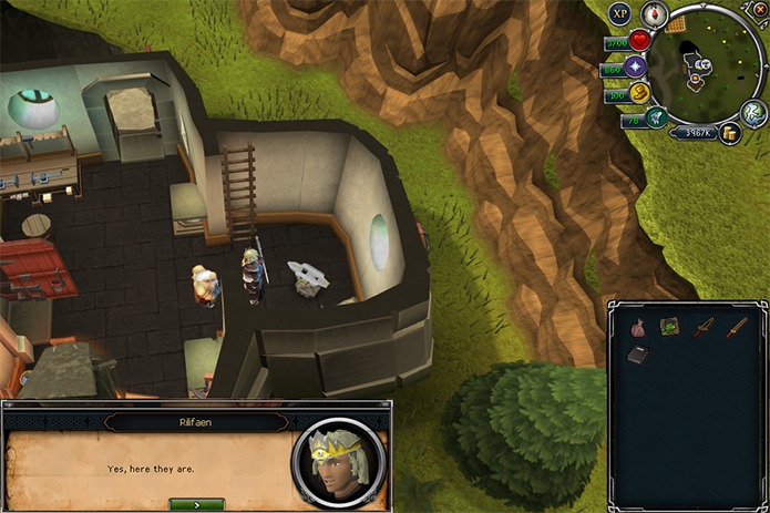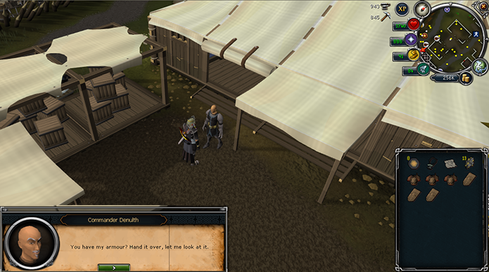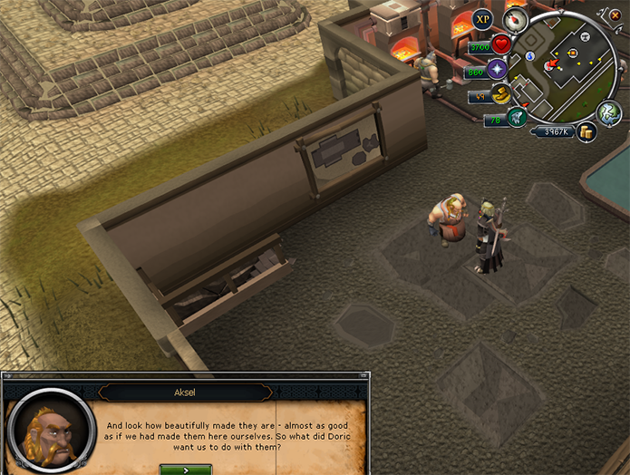 Doric vás pošle vykovat 3x bronze platebody a 3x bronze kiteshield pro Commandera Denultha v Burthorpe. Burthorpe má vlastní důl, pec i kovadlinu, vše můžete vyrobit až na místě.