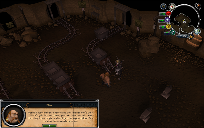 Promluvte si s Doricem. Sten z Artisan’s Workshop potřebuje 5x bronze full helm, vykovejte je (musíte až potom, co vezmete task). Skočte za Stenem a předejte mu helmy, nyní se ale menší brigádě nevyhnete. Položte pět yardů bronzových kolejnic (5x bronze track 100%, návod zde).