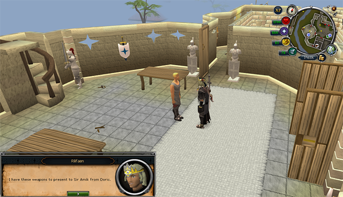 Doric vám tentokrát ukáže zajímavou objednávku. Někdo mu v noci hodil před dílnu bednu s anonymním požadavkem na 25x adamant scimitar. No co, zákazník je zákazník, tak vykovejte potřebné zbraně, naládujte je do bedny a tu položte na smluvené místo – totiž pařez za faladorským obchodem s drahokamy. Abyste se ujistili, že nezásobujete žádné lapky, počkáte si u zdi obchodu.