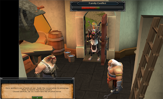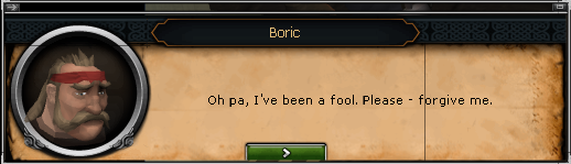 Sir Amik s ním okamžitě utne veškerá jednání. Vy se dozvíte, že podlý trpaslík je ve skutečnosti Boric, Doricův syn. Vezměte ho tedy za otcem, aby si vše vyříkali mezi čtyřma očima (pochopitelně s vámi jako s nestranným porotcem).