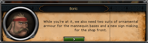 Až se všichni společně obejmete a vypláčete, Boric s Doricem se dohodnou, že si založí firmu Doric & Syn s vámi jako business partnerem. Zatímco si trpaslíci vychutnávají chvilku pro sebe, vy dostanete rudu, ze které máte vykovat vývěsní štít, ozdobné kroužkové a plátové brnění.