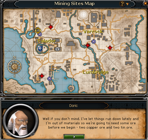 První zastávka, Dwarven Mine. Buď běžte na východ od Dorica a slezte po žebříku, nebo se proběhněte podchodem ve Faladoru.