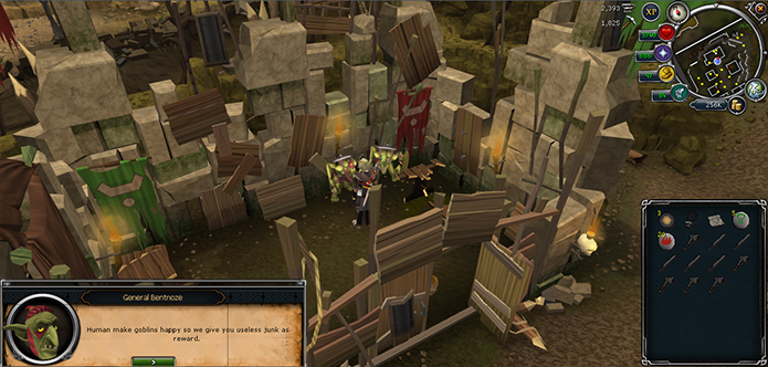 Až se vrátíte se zbraněmi, zjistíte, že je generálové chápou jako dárek. Když se je pokusíte vyvést z omylu, pohrozí vám, že Dorica u ostatních klanů pomluví. Se skřípěním zubů jim tedy předejte dar a od goblinů si vezměte na památku nějaké bezcenné harampádí (ve skutečnosti knížka o Smithingu).