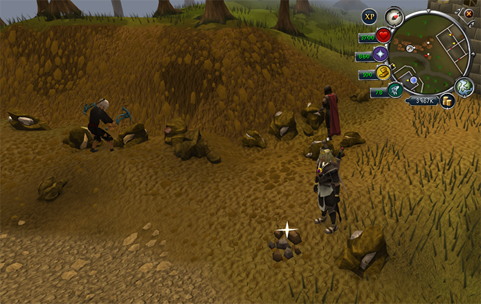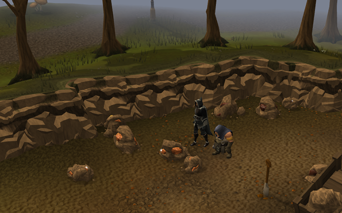 Teleportněte se k lodestonu v Port Sarim, a doběhněte k poslední stanici, dolu v Rimmingtonu. Těsně předtím, než vstoupíte, uvidíte čaroděje s trpaslíkem, jak očarovávají skálu a pak se teleportují pryč. Vy to neřešte, prostě vytěžte nějakou jinou.